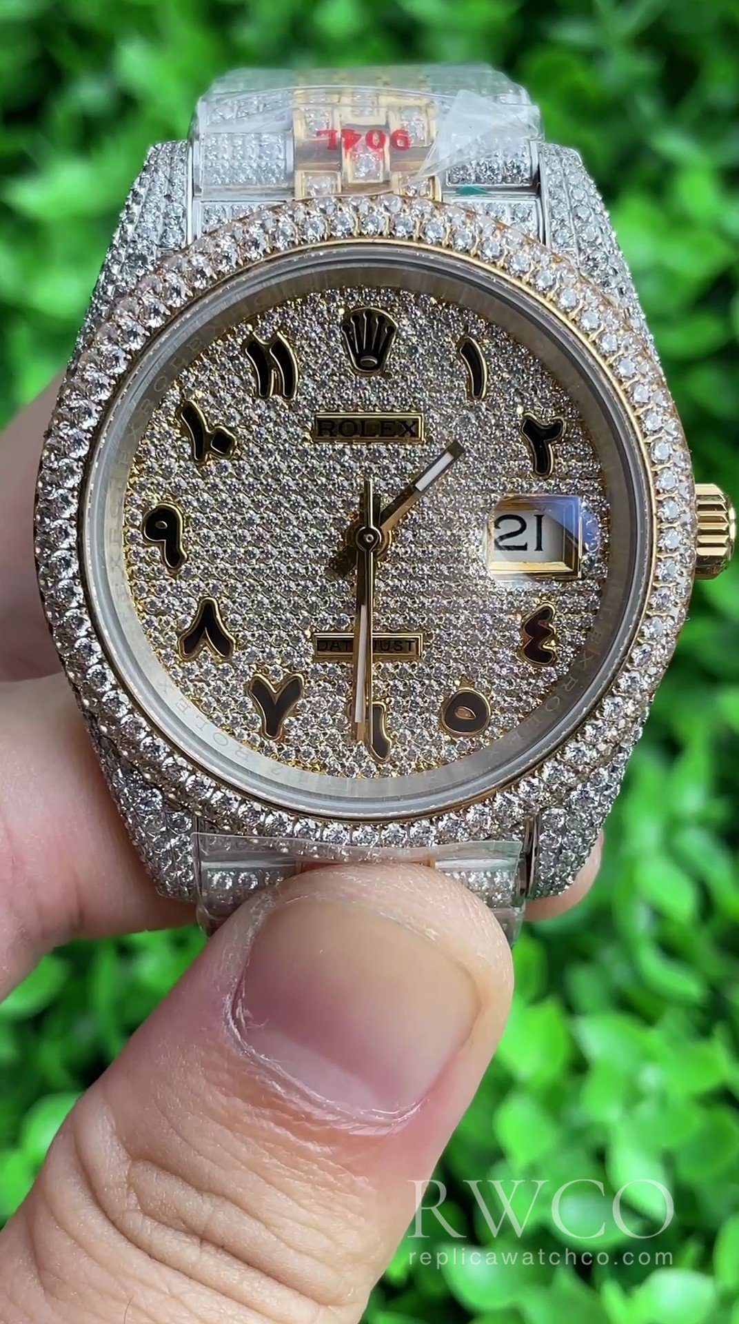 Diese Rolex Datejust ist ein außergewöhnliches Beispiel für Haute-Chic-Uhrmacherkunst. Das atemberaubende Vollpavé-Diamantenbesatz an Gehäuse, Lünette und Zifferblatt verleiht ihr eine ganz besondere Note. Die funkelnde Diamantenoberfläche wird durch markante, applizierte arabische Ziffern akzentuiert, die für eine einzigartige kulturelle Note und hervorragende Ablesbarkeit sorgen. Diese individuell gestaltete Uhr mit dem ikonischen Datumsfenster und der Zykloplupe verkörpert den Inbegriff von Luxus und garantiert eine unvergleichliche Präsenz am Handgelenk.